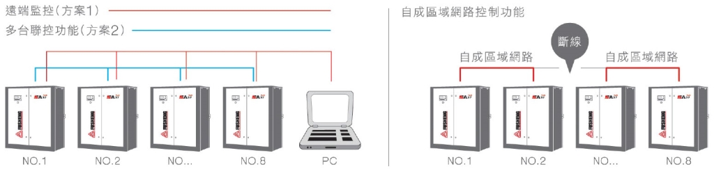 ● 多機聯控斷線時,自成區域網路控制功能,確保供氣穩定。