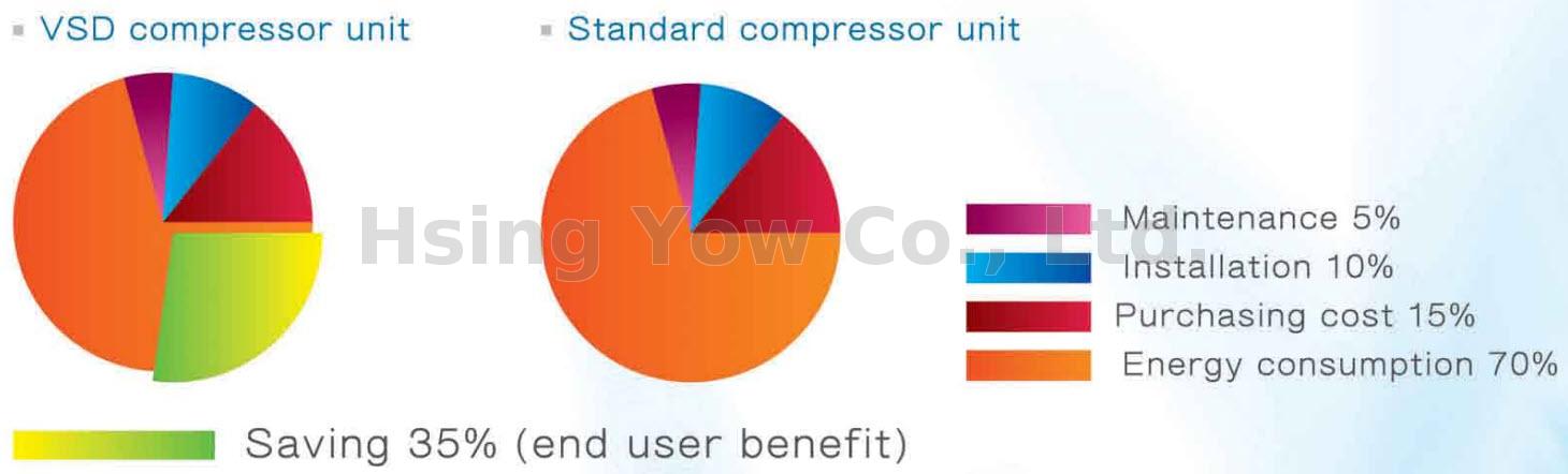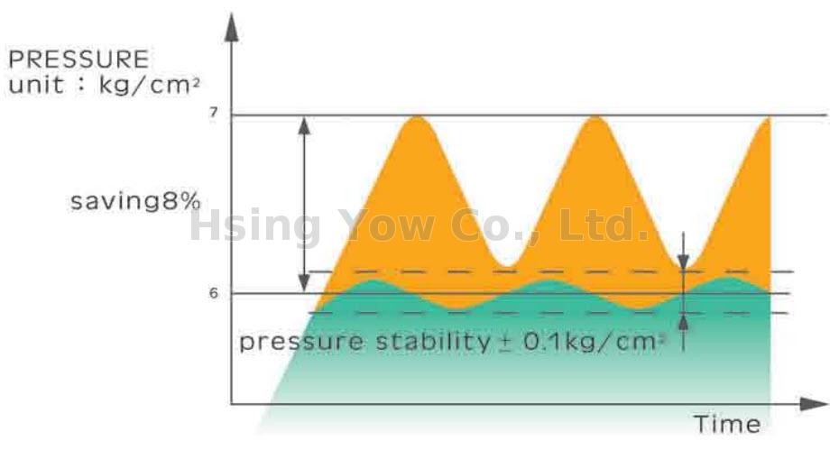 ● Saving up to 8% energy that is additionally required in traditional load/unload control compressor units due to pressure difference setting of 1kg/cm